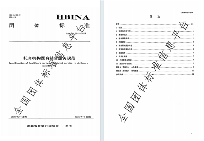 此次发布的《托育机构医育结合服务规范》,由武汉大学中南医院、武汉大学护理学院、湖北省育婴行业协会牵头编制,标准编号 T/HBINA 001—2025,于2026 年1月正式实施。标准系统构建了涵盖总体要求、机构与人员资质、服务机制、健康监测、营养喂养、早期发展促进、应急处置及医——托——家——社联动等全流程规范体系,破解了长期以来托育行业医育融合边界模糊、服务标准缺失的瓶颈。作为托育服务质量提升行动的重要落地举措,该标准的出台将全面推动托育机构服务质量升级,为广大家庭提供更安心、更科学的婴幼儿照护方案。