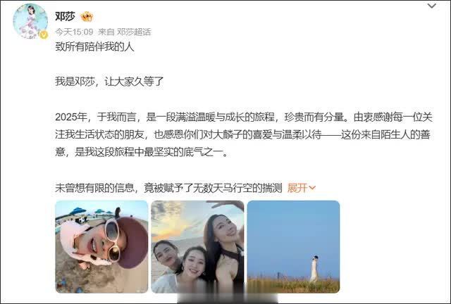 3月15日,制片人于正在微博分享了一组“年后生活碎片”,照片中他与邓莎、王星越等艺人友人相聚,氛围温馨。配文“感恩岁月,感恩遇见,一切都很美好。然后我们继续快乐的生活,努力的工作,把这一生活精彩。”传递着岁月静好。然而,在这看似寻常的聚会合照背后,邓莎那张微笑的脸,却承载着两个月前一场关于婚姻、独立与重生的公开剖白。
